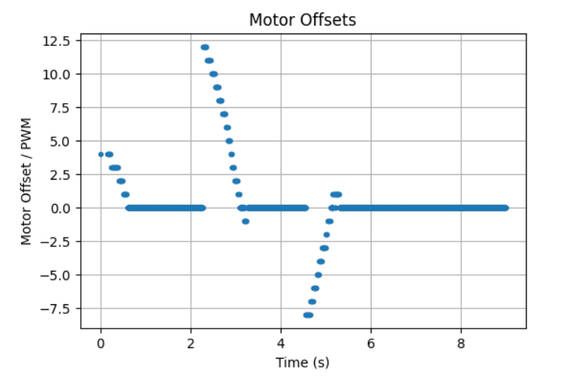 Here are plots of the set point, angle, and motor offsets all with respect to time: